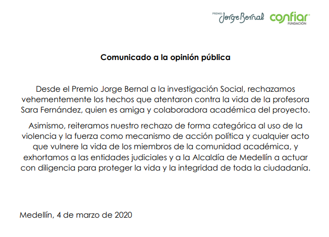 Comunicado a la opinión pública Desde el Premio Jorge Bernal a la investigación Social, rechazamos vehementemente los hechos que atentaron contra la vida de la profesora Sara…