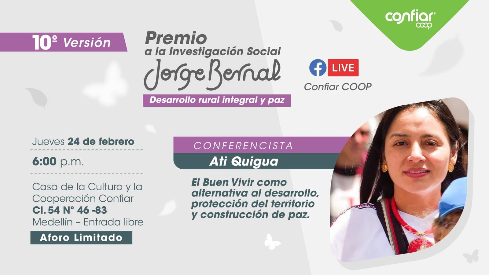 Tendremos la conferencia El Buen Vivir como alternativa al desarrollo, protección del territorio y construcción de paz de Ati Quigua, líder indígena, actual concejala de Bogotá, defensora de los derechos de la mujer y promotora del cuidado del medioambiente, especialmente del agua.
