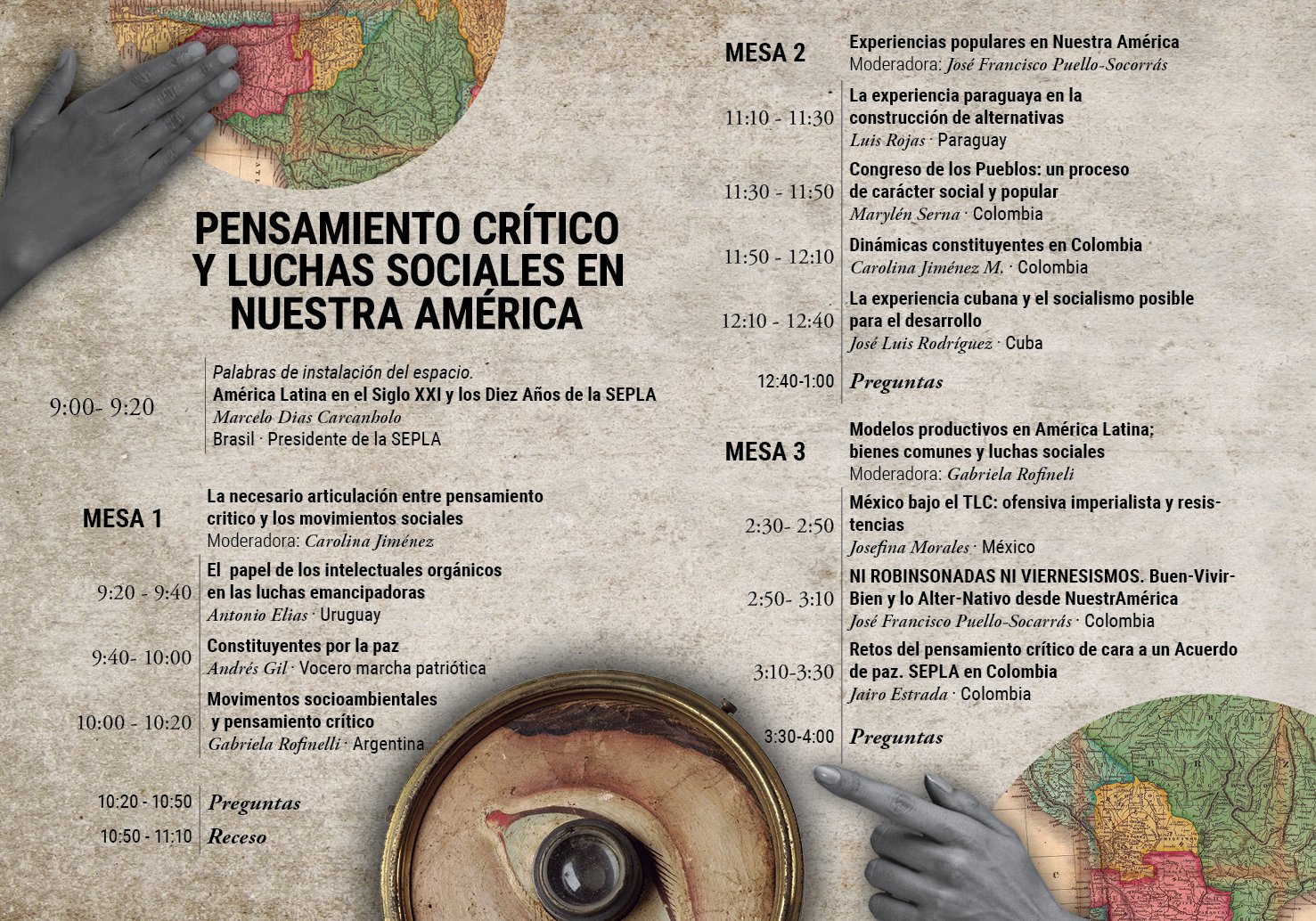 La maestría en Estudios Políticos Latinoamericanos; y la Facultad de Derecho, Ciencias Políticas y Sociales de la Universidad Nacional de Colombia, invitan al evento Pensamiento crítico y luchas sociales en nuestra América Latina, que se llevará acabo el 13 de noviembre de 2015, de 8:00 AM a 4:00 PM, en el auditorio Virginia Gutierrez Edificio de Posgrados de Ciencias Humanas de la Universidad Nacional de Colombia sede Bogotá.